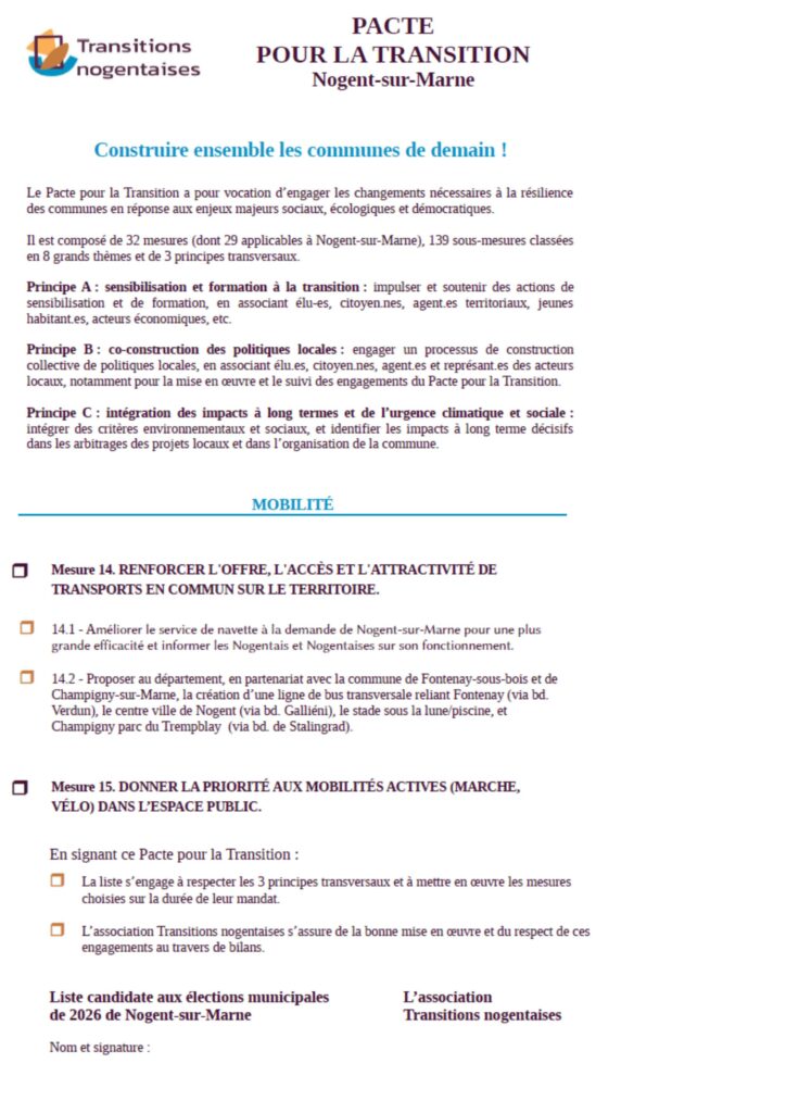 Du 10 février au 10 mars 2026 invitation des 8 candidats aux municipales de Nogent-sur-marne à venir signer notre Pacte pour la Transition :